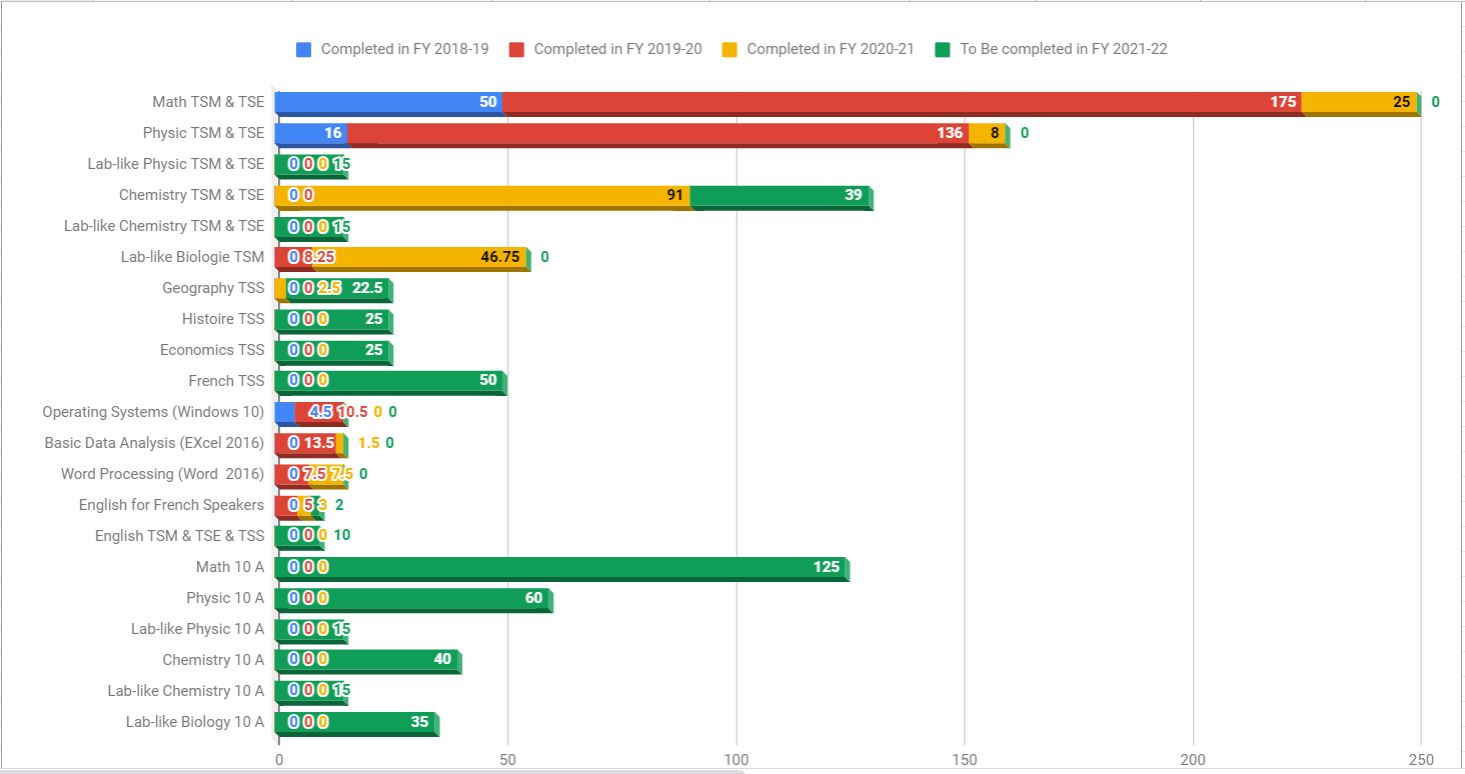 We have developed the digital format of some of the essential courses at the high school level. The blue, red, and yellow progress bars on the graph below represent the number of the digital lessons or labs we have completed during our 2018-19, 2019-20, and 2020-21 fiscal years, respectively. The green progress bars represent the number of digital lessons or labs we expect to develop throughout our 2021-22 fiscal year.