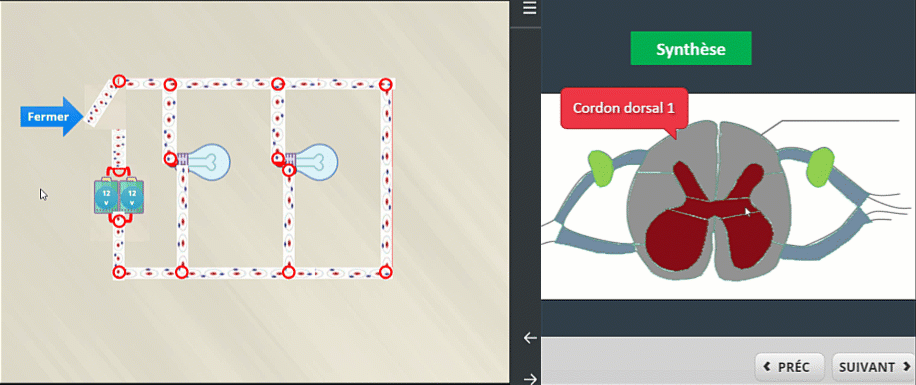 The interaction on the right on the above image, for example, is a summary of a lesson on the spinal cord from our Biology course. It follows several animations that allow students to understand the subject matter substantially. Its main goal is to enable learners to guess the name of each part of the spinal cord and click on it to verify.